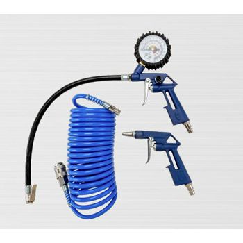 Osnovni set za rad s kompresorom, set pneumatskog alata u tri dijela sadrži pištolj za ispuhivanje, pištolj za pumpanje guma s manometrom i spiralno crijevo sa spojnicama.