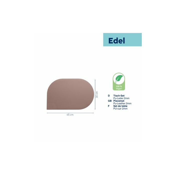 Podmetač za stol Edel od visokokvalitetne PU kože u sofisticiranoj bež boji koja vuče na boju pijeska unosi eleganciju i moderni stil u svaki prostor za blagovanje. S dimenzijama 45×30 cm i debljinom od 2 mm, ovaj podmetač pruža optimalnu zaštitu sto