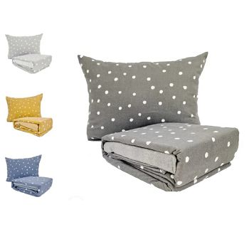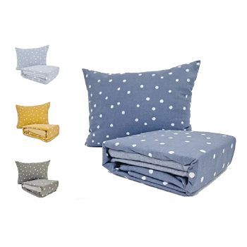 Set s navlake za poplun i jastučnica A Pois izrađen je od pamučnog perkala, tkanine poznate po svojoj glatkoj, prozračnoj i izdržljivoj strukturi. Na bijeloj podlozi nalazi se bezvremenski točkasti uzorak, s crnim točkicama različitih ve