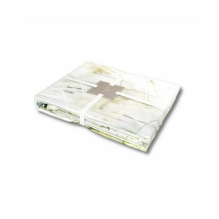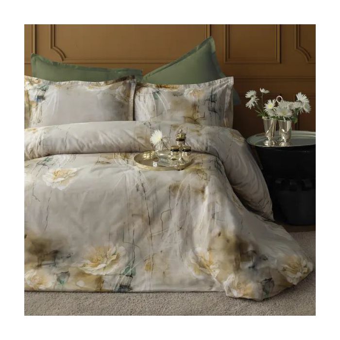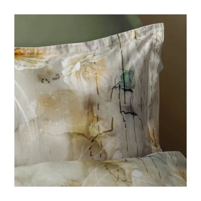 Set plahti s jastučnicama Rivoli izrađen od pamučnog satena profinjenog dezena u zlatnim i zelenim tonovima koji odiše elegancijom. Apstraktni motivi i efekt ručno oslikane teksture unose dašak umjetnosti u svaku spavaću sobu. Gornja str