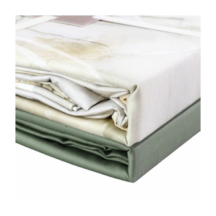Set s plahtama Catan izrađen je od finog pamučnog satena s nježnim dezenom grana s tankim lišćem u zelenim tonovima na krem podlozi. Catan gornja plahta i gornja strana jastučnica imaju dezen dok su donja strana jastučnica i donja plaht