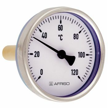 Afriso TB 63 termometar za mjerenje temperature u gotovo svim vrstama instalacija. Promjera 63 mm, duljina sonde je 45 mm, priključak 1/2" i raspon mjerenja od 0-120 °C.