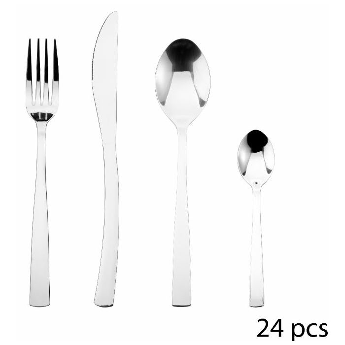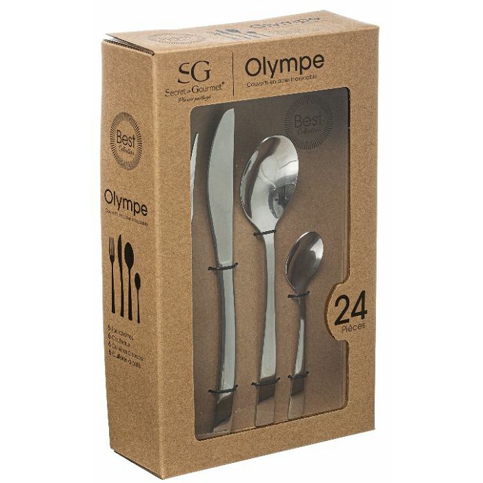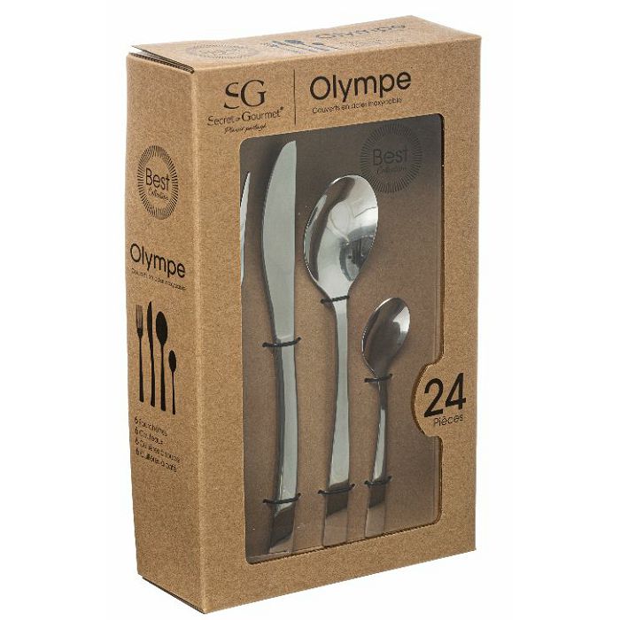 Opis:Za elegantno posluživanje obroka potreban je odgovarajući pribor za jelo za najmanje šest osoba. Set Olympe sadrži 6 žlica za juhu, 6 vilica, 6 noževa i 6 čajnih žličica u estetskom pakiranju. Izrađeno je od nehrđajućeg čelika, izdržljivo i može