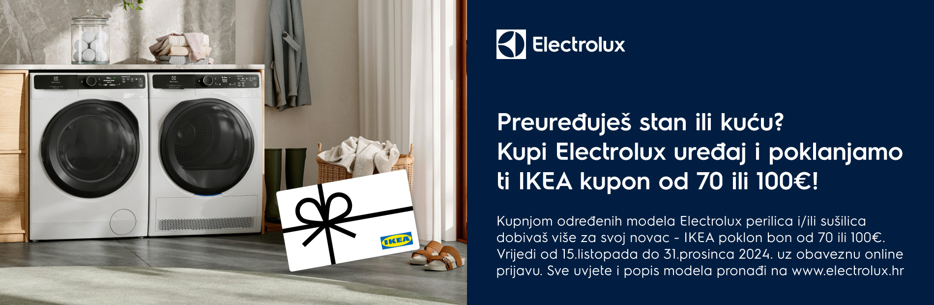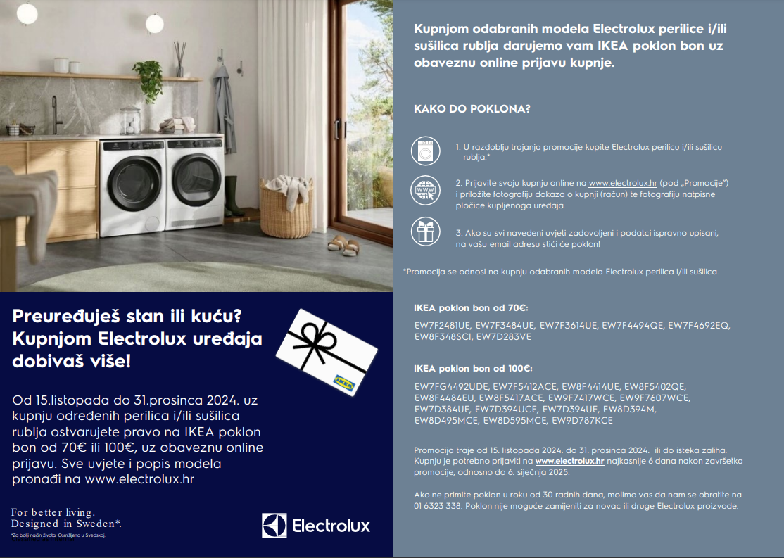 Kupnjom određenih modela Electrolux perilica i/ili sušilica dobivaš više za svoj novac-IKEA poklon bon od 70 ili 100 eura!Vrijedi od 15. listopada do 31.prosinca 2024. uz obaveznu online prijavu.Sve uvjete popis modela pronađi na www.electrolux.hr.