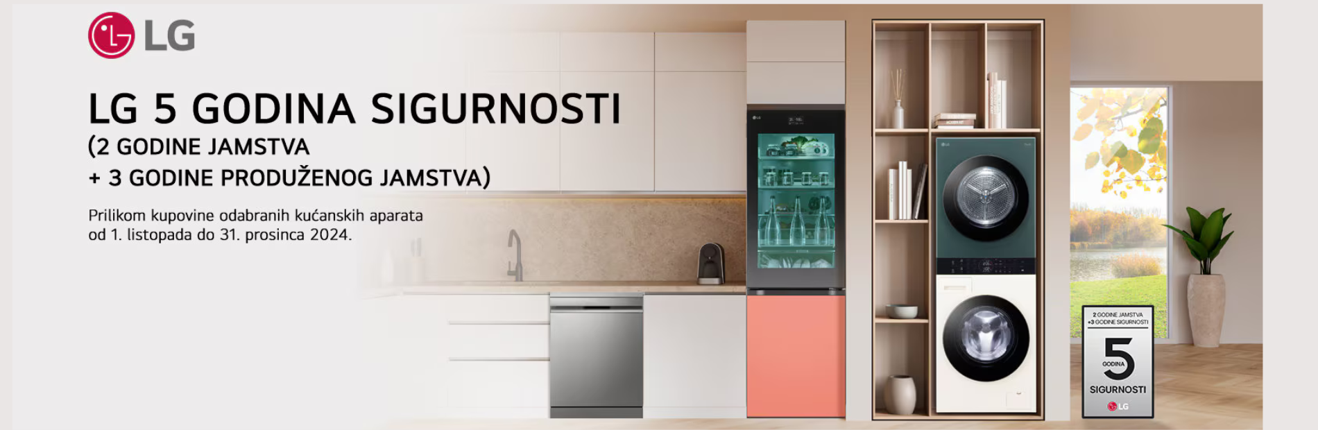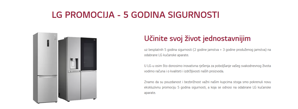 Učinite svoj život jednostavnijim uz besplatnih 5 godina sigurnosti (2 godine jamstva + 3 godine produženog jamstva) na odabrane LG kućanske aparate. U LG-u osim što donosimo inovativna rješenja za poboljšanje vašeg svakodnevnog života vodimo računa i o kvaliteti i izdržljivosti naših proizvoda. Znamo da su pouzdanost i bezbrižnost važni našim kupcima stoga smo pokrenuli novu ekskluzivnu promociju 5 godina sigurnosti, a koja se odnosi na odabrane LG kućanske aparate.