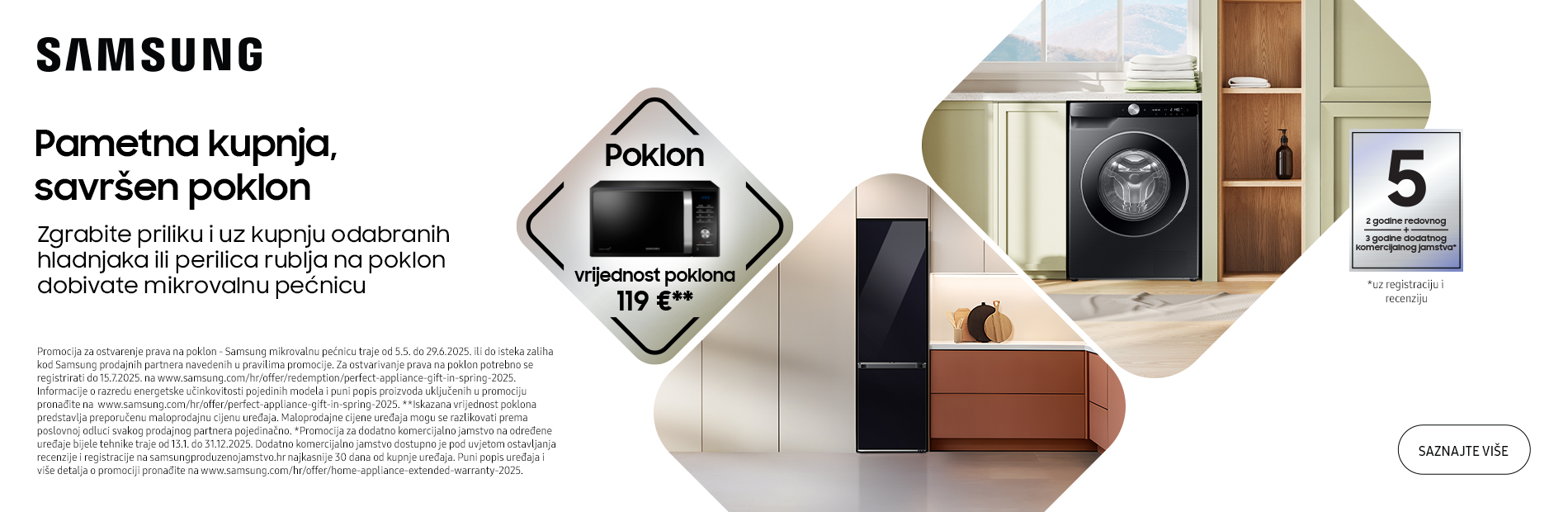 Uz kupnju kupnju odabranih Samsung hladnjaka ili perilica rublja dobijete mikrovalnu pećnicu na poklon. Više informacija o mikrovalnoj pogledajte ovdje.