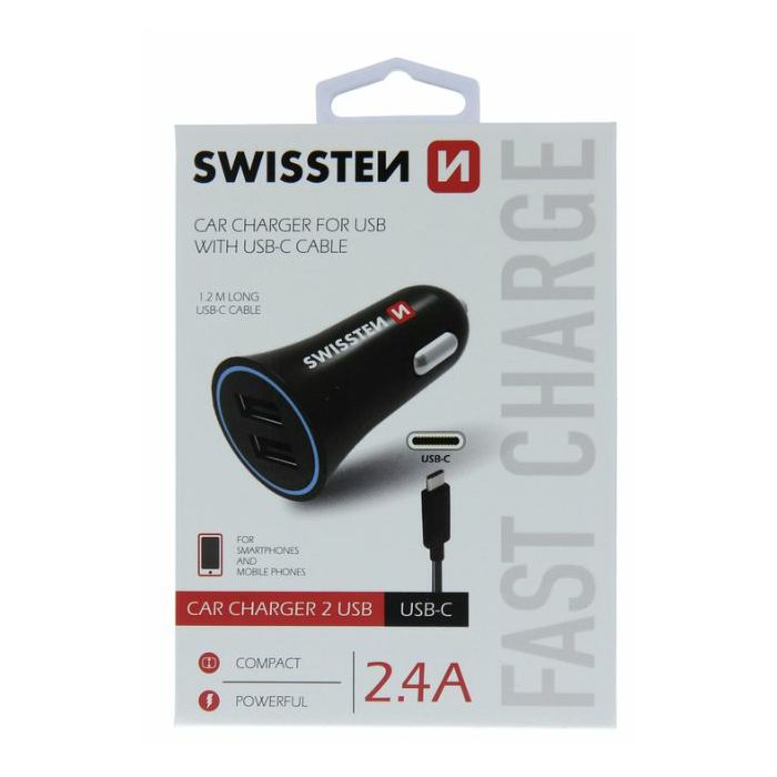 PUNJAČ SWISSTEN ZA AUTO 2 X USB 2.4 A CRNI + KABEL ZA PUNJENJE USB-USB C