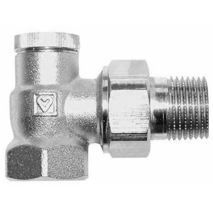 Herz RL povratni ventil kutni VEL. 1/2. Priključak grijaćeg tijela konično brtvljen. Univerzalna izvedba s posebnim kolčakom za navojnu cijev i priključak steznim kompletom.