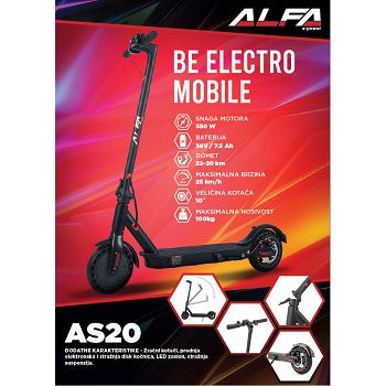 Veličina kotača 20” + 16” Boja Crno-siva Vrsta okvira Aluminij Maksimalna brzina 30 km/h Motor 350 W Baterija 36 V, 10.2 Ah Vrijeme punjenja 6-7 h Domet 25-30 km* (*ovisno o konfiguraciji terena, vremenskim uvjetima i načinu vožnje) Vrsta koč