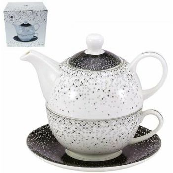 Porculanski čajnik s pripadajućom šalicom i tanjurićem krase prekrasne točkice. Idealno rješenje za popodnevni odmor uz knjigu, a ujedno i p