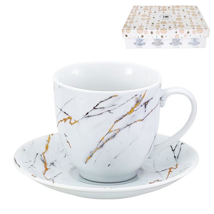 ŠALICE ZA KAVU S TANJURIĆIMA 6/1 PORCULAN 180 mL – MRAMORNO-ZLATNI DEKOR