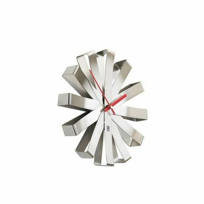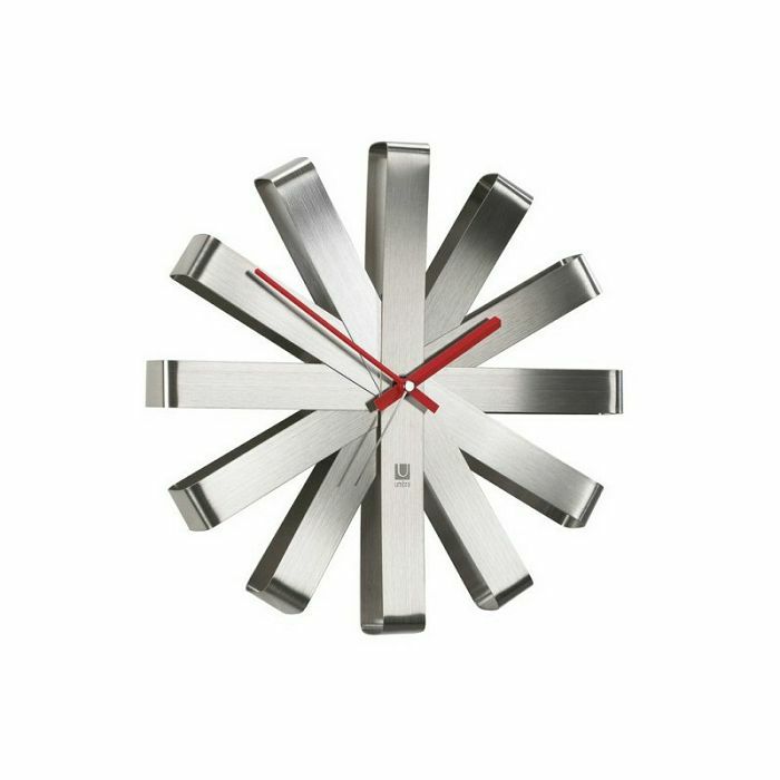 Neobičan oblik zidnog sata Ribon privlači pažnju. Sat je izrađen od crnog metala. Savijeni metal u obliku vrpce stvara prekrasan oblik. Zanimljiva alternativa satovima sa standardnim brojevima na brojčaniku. Težina: 1 kg, Kvalitetni zidni sat Ribon i