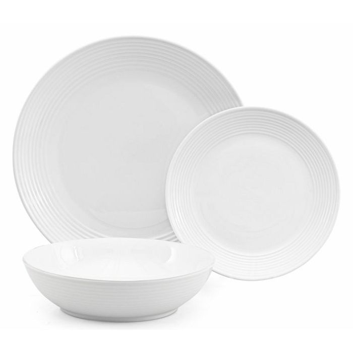 Servis za jelo Athena od 18 tanjura od bijelog porculana s reljefom u obliku krila na rubu.