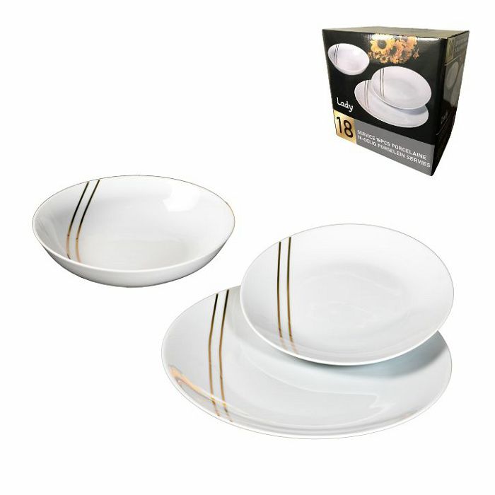 Porculanski servis za jelo "Lady" sadrži 18 elegantno dizajniranih dijelova s decentnim zlatnim crtama.