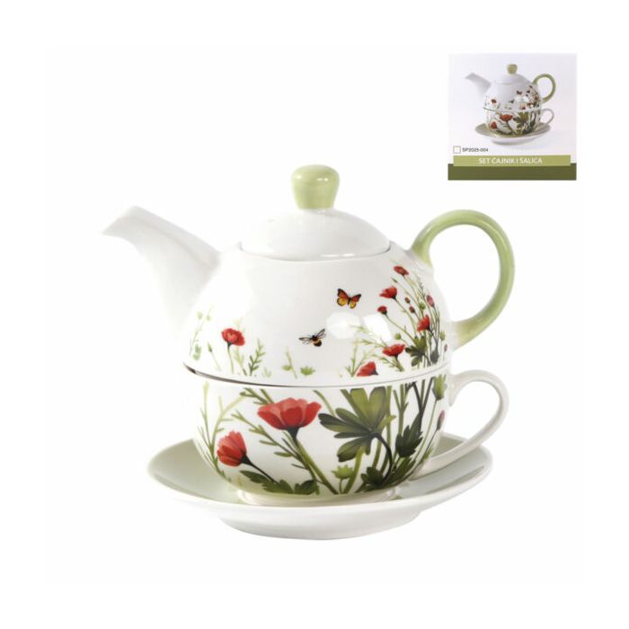 Porculanski čajnik s pripadajućom šalicom i tanjurićem krase prekrasni cvjetni motivi makova i leptira, koji stvaraju osjećaj mira i svježin
