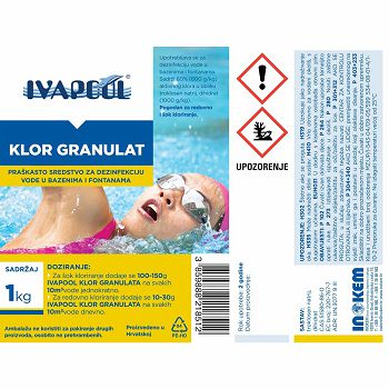 IVAPOOL Klor granulat je praškasto sredstvo sa 60% aktivnog klora za dezinfekciju vode u bazenima i fontanama.