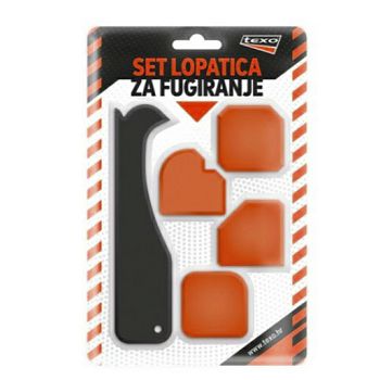 Set lopatica za fugiranje, TEXO. Texo set lopatica koristi se za brzo i jednostavno fugiranje, a sadrži 4 komada lopatica za fugiranje različitih završnih profila kao i 1 komad plastičnog alata za uklanjanje starog silikona. Odličan je za elastične f
