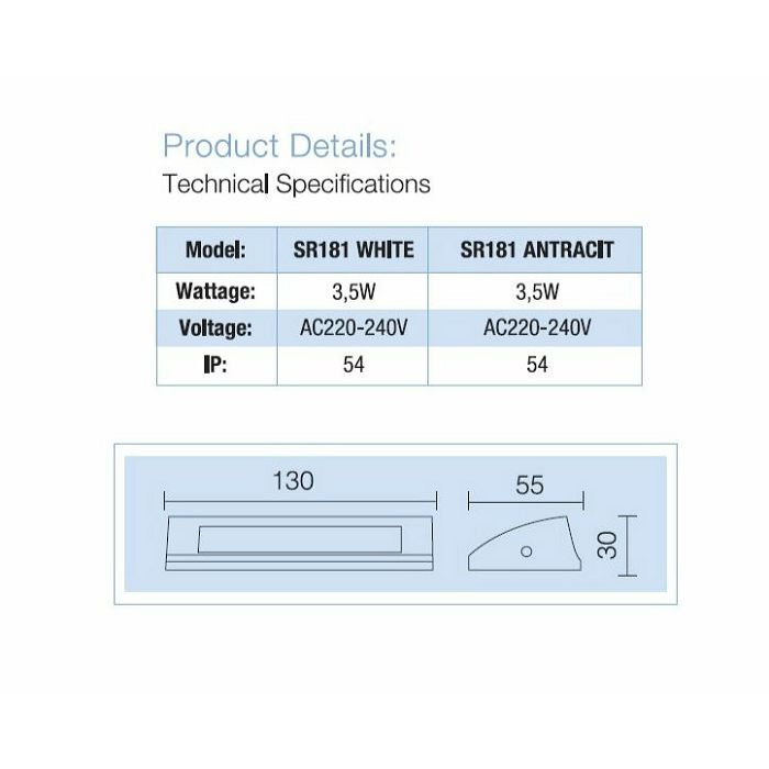 Zidna vanjska SR181 WHITE Boja: Bijela Podnožje: Integrirani LED 3,5W, 3000K Stupanj zaštite: IP54 Dimenzija artikla: 130 x 55 x 30mm Materijal: Aluminij U našem asortimanu osim Zidna vanjska SR181 WHITE potražite vanjsku rasvjetu zid