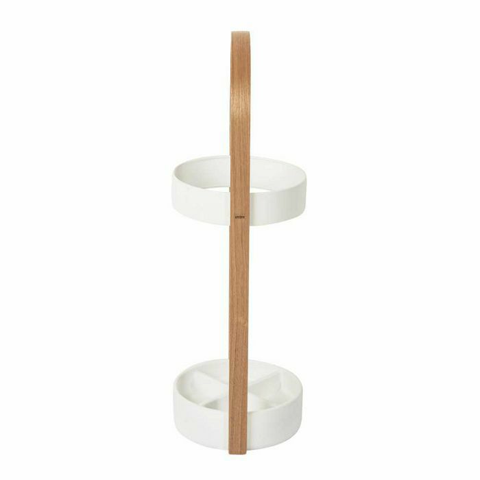 Stalak za kišobrane Hub u bijeloj i prirodnoj boji tvrtke Umbra još je jedna ilustracija njihovog modernog, ležernog i inovativnog dizajna. Izrađen od kompozitnog i prirodnog drveta s vodootpornom bazom od smole, ovaj stalak za kišobrane savršen je z