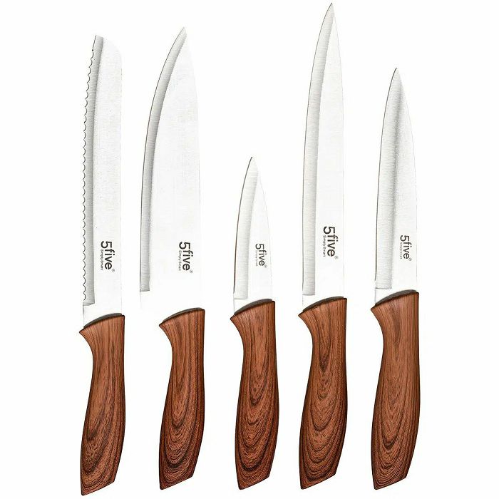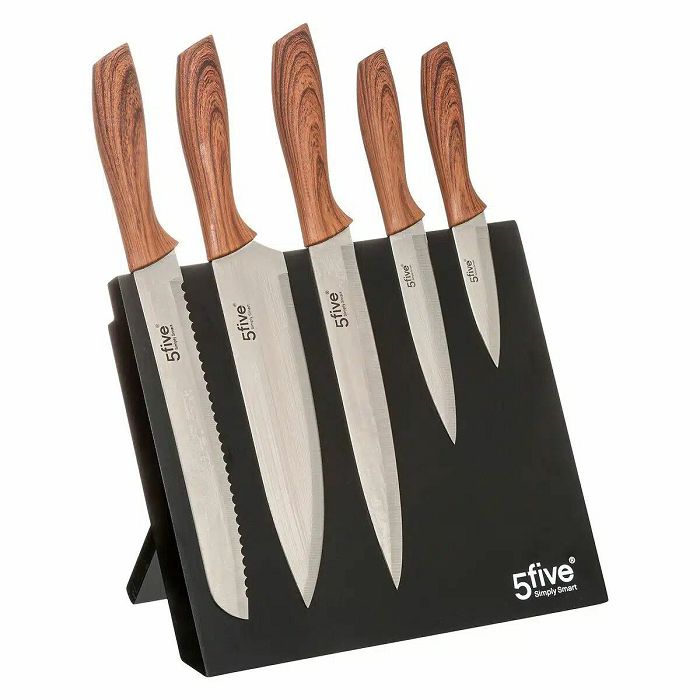 Svakoj kuhinji potrebni su kvalitetni noževi. Ovaj set od 5 noževa s magnetom koji ih pridržava idealno su rješenje koje će Vam olakšati pripremu svakog jela. Izrađeno od metala i MDF-a. Dimenzija: 23,2x19x32 cm.