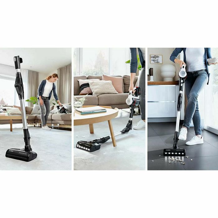 BOSCH Unlimited 7 BSS71125AH uspravni bežični usisavač kombinira snagu i praktičnost, omogućujući vam jednostavno i učinkovito čišćenje doma. Ovaj model dolazi s TurboSpin motorom i motoriziranom mlaznicom s LED diodama, osiguravajući dubinsko čišćen