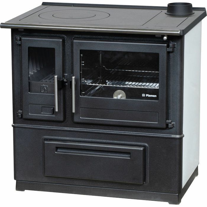 Štednjak PLAMEN 850 odlikuje se lijepim izgledom, prostranim ložištem od kvalitetnog sivog lijeva, prostranom pećnicom i ladicom za drva.
