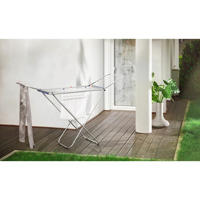 Stabilna sušilica rublja sa preklopnim stranicama, idealna za unutarnju i vanjsku upotrebu, 18 m površine za sušenje = do 2 perilice, visina preklopnih stranica 100 cm, mogućnost vješanja dugih odjevnih predmeta, 4 rupe za trake za v