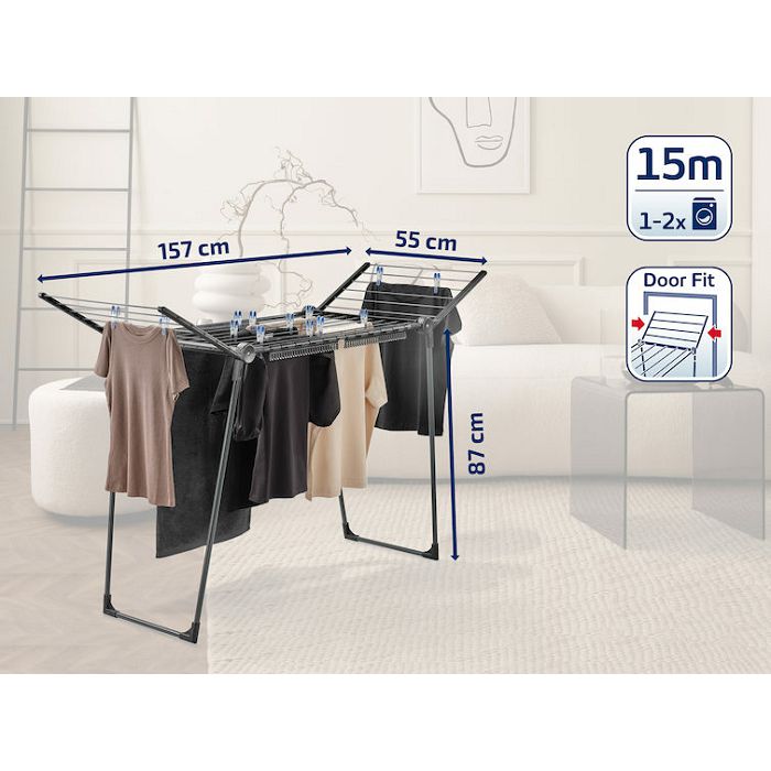 stabilna Leifheit sušilica rublja Pegasus 150 Solid Slim Black pokazuje svoju elegantnu stranu u visokokvalitetnom crnom i antracit dizajnu. Iako kompaktan, zauzima malo prostora za sušenje rublja, a sa svojom dubinom od 55 cm prolazi kroz sva vrata.