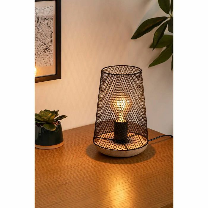 Metalna stolna lampa ZELY 23 cm, crna kombinira crnu metalnu konstrukciju s drvenim detaljima, što joj daje moderan i istovremeno topao izgled. Njeno mrežasto sjenilo stvara jedinstveni svjetlosni efekt i dodaje originalnost svakom interijeru. Zahval