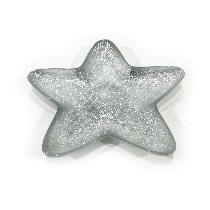 Stakleni tanjuru u obliku zvijezde, srebrne boje, s promjerom od 23,5 cm.