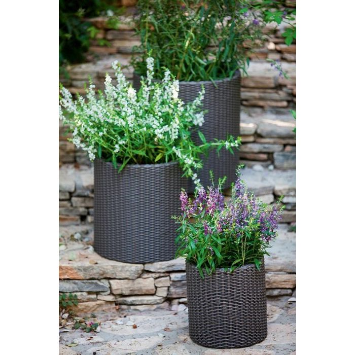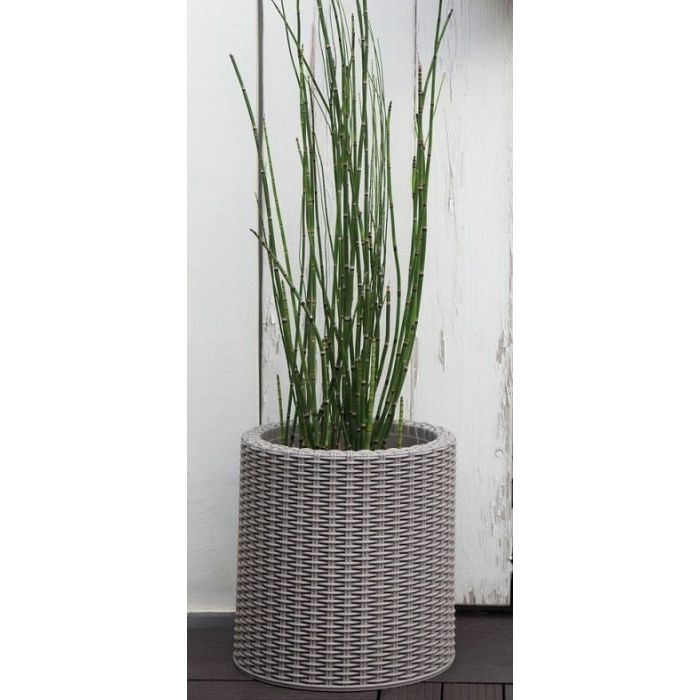 Okrugla CILINDAR ŽALDIJICA M srednje veličine sa svojom površinom stiliziranom da podsjeća na prirodno tkanje ratana izvrsno će pokazati ljepotu biljaka na terasi ili balkonu Vašeg domaćinstva. Izuzetno dobro prilagođen moder