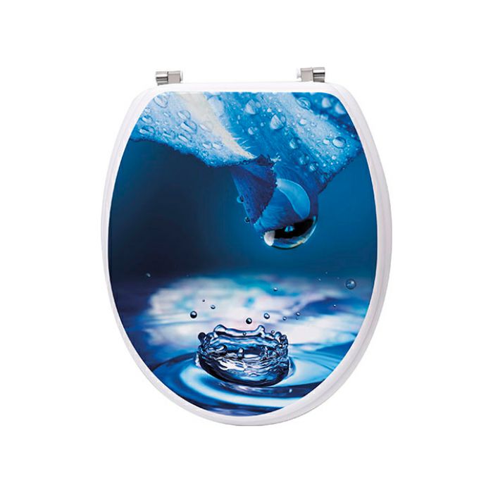 Azzura daska za WC bijele pozadine i plave boje na kojoj su prikazane kapljica rose na listu i vodi, unijeti će dašak svježine u Vašu kuaponicu. Idealna je za sve ljubitelje vode i plavih tonova, te motiva koji prikazuju neopisivi trenutak u vremenu.
