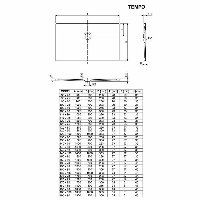 Pravokutna verzija plitke tuš kade Tempo dostupna je u puno različitih dimenzija, a namijenjena je ugradnji u razinu poda zbog svojeg niskog profila.