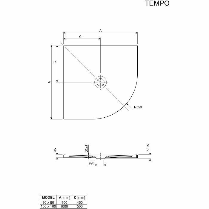 Tempo je polukružna vrlo plitka tuš kada modernog dizajna namijenjena ugradnji u razinu poda. Dostupna je u dvije standardne dimenzije.