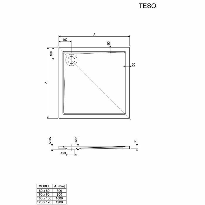 Kvadratna verzija plitke tuš kade Teso dostupna je u nekoliko standardnih dimenzija.