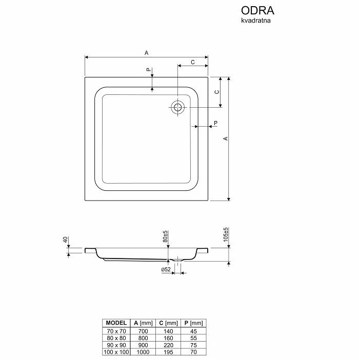 ODRA:Odra je klasična tuš kada povećane dubine i standardnog otvora sifona. Omogućuje kombiniranje sa svim standardnim modelima tuš paravana. Dostupna je u puno različitih dimenzija.