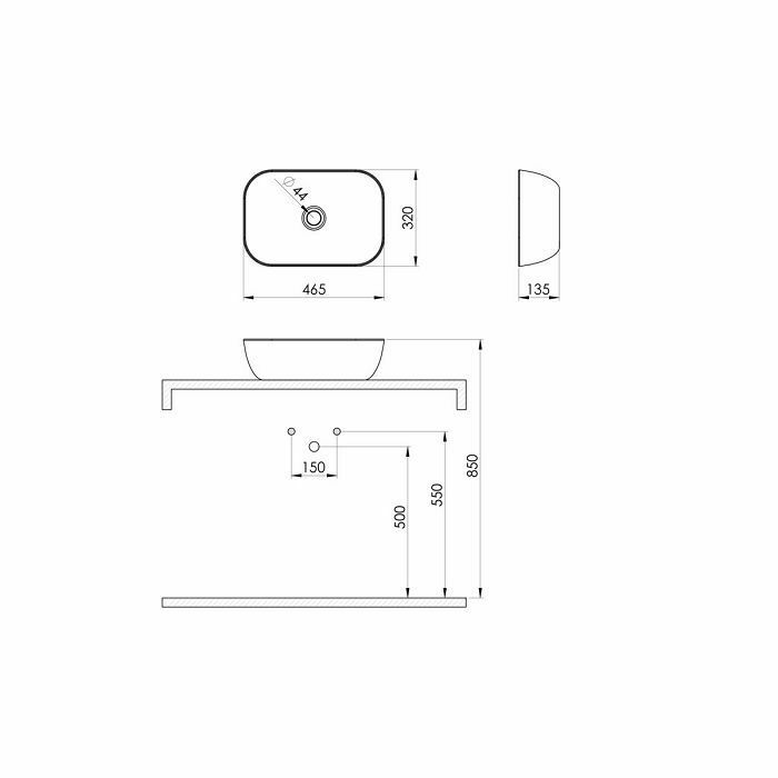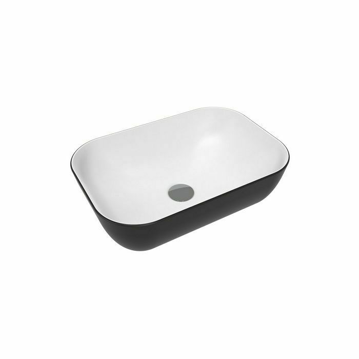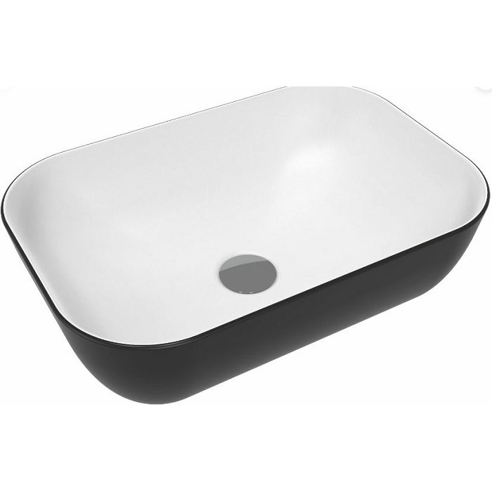 Concepto Bell 46,5 nadgradni umivaonik modernih elegantnih linija i pravokutnog oblika, korito umivaonika je mat bijele boje, a vanjski dio je mat crne boje. Izrađen od kvalitetne keramike, za ugradnju na ploču. Bez rupe za miješalicu. Umivaonik je b