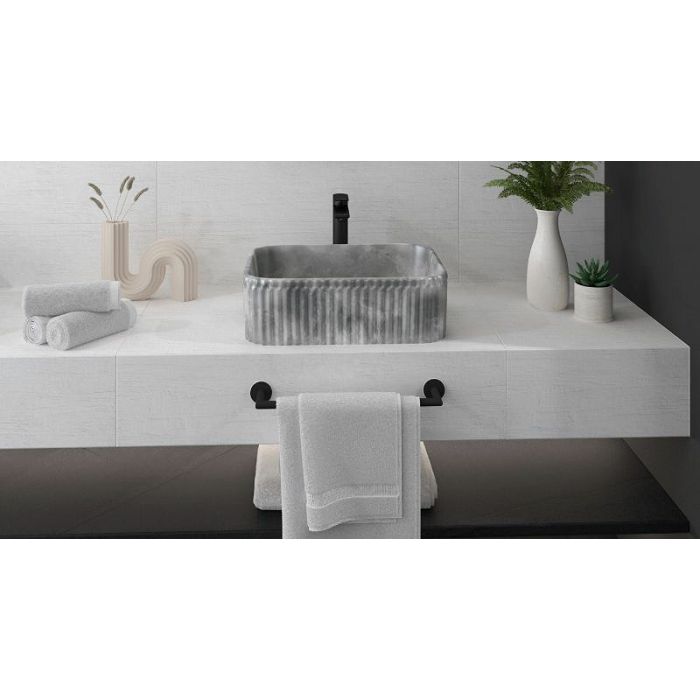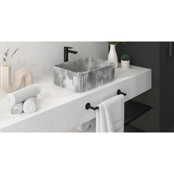 Modernim dizajnom, reljefnom površinom, pravokutnim oblikom i zanimljivim uzorkom mramora izvrsno se uklapa u suvremeno uređene kupaonice u koje unosi dozu luksuza i elegancije.