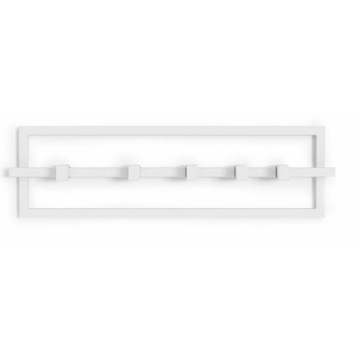Dekorativna i funkcionalna u isto vrijeme, moderni zidni ormar Cubiko marke Umbra ima 5 pomičnih kukica na metalnoj traci.