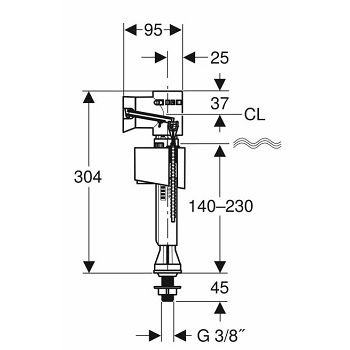 Opis GEBERIT ventil za punjenje tip 333, priključak za vodu sa strane. Namjena upotrebe: Za pitku vodu Za keramički vodokotlić Za priključke za vodu 3/8'' Za ugradnju u nadžbukne vodokotliće s priključkom za vodu sa strane Značajke: Pri