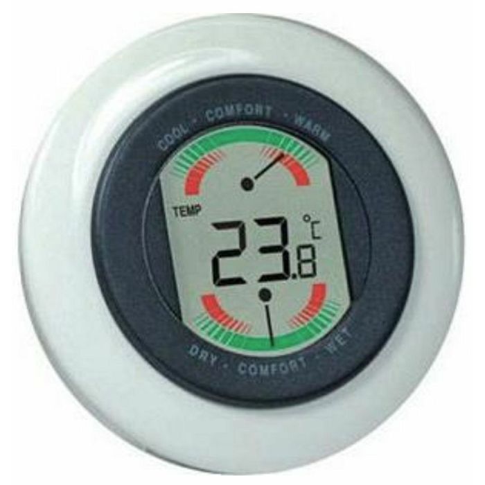 Termo-Higrometar stanica za nadzor kvalitetne sobne temperature i vlažnosti. Pokazivač unutarnje temperature i vlage. Zaslon sa velikim brojkama te simbol koji pokazuje kvalitetni ili lošiji postotak vlage u pros